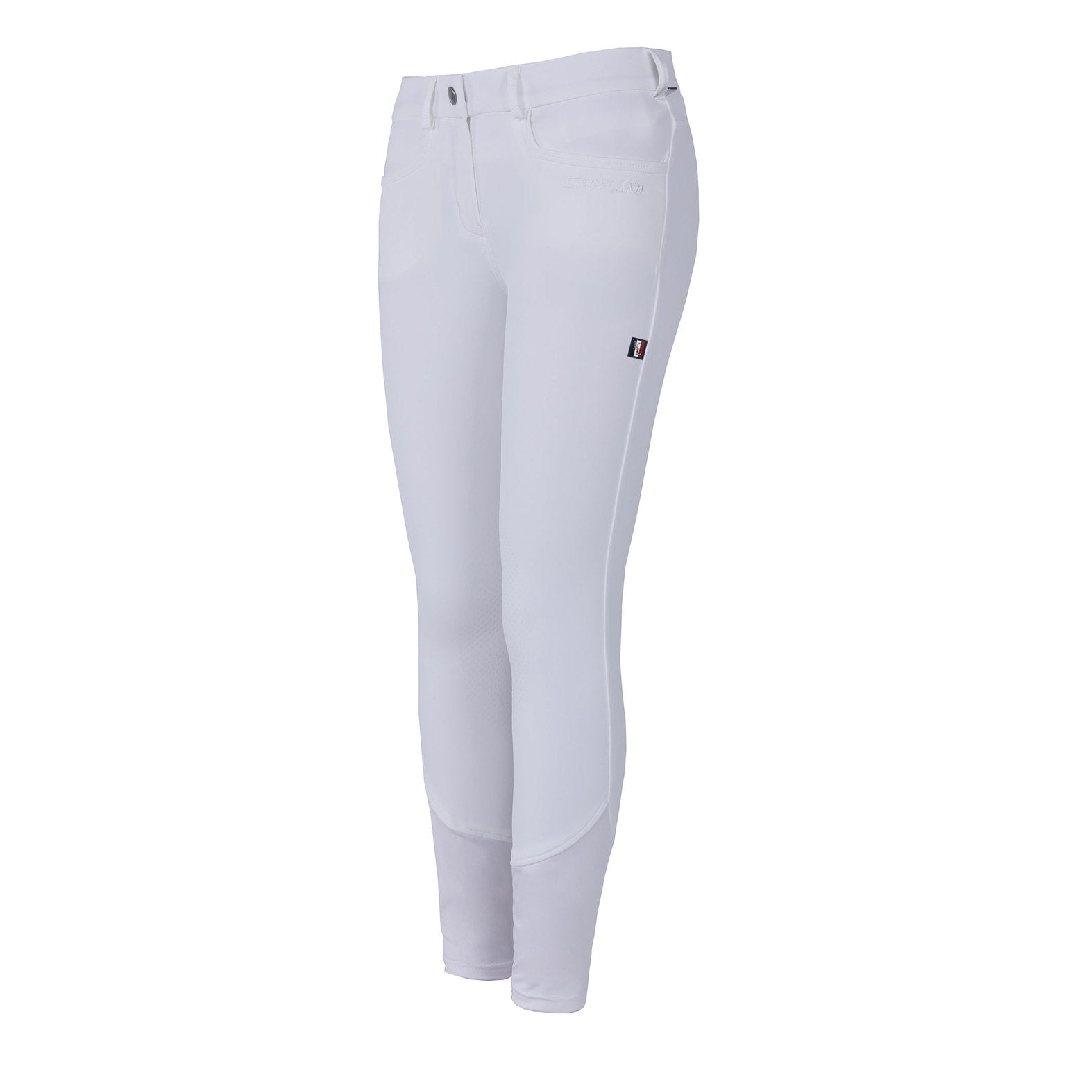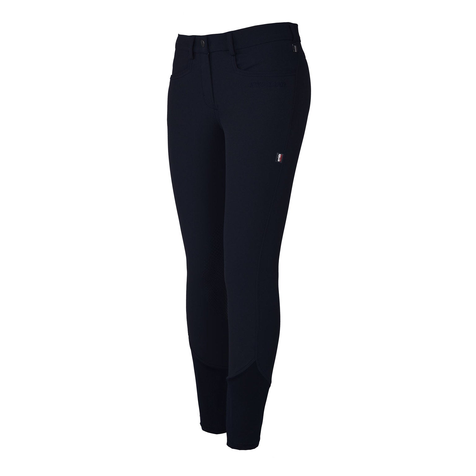 Breeches for women with one button in front and lower rise, optimal comfort and 4-way stretch and knee grip. Water repellent, breathable and dust repellent. Bottom calf in Lycra for better comfort. Piping along pocket edge. Embroidery under front pocket.Corporate patch on left thigh.