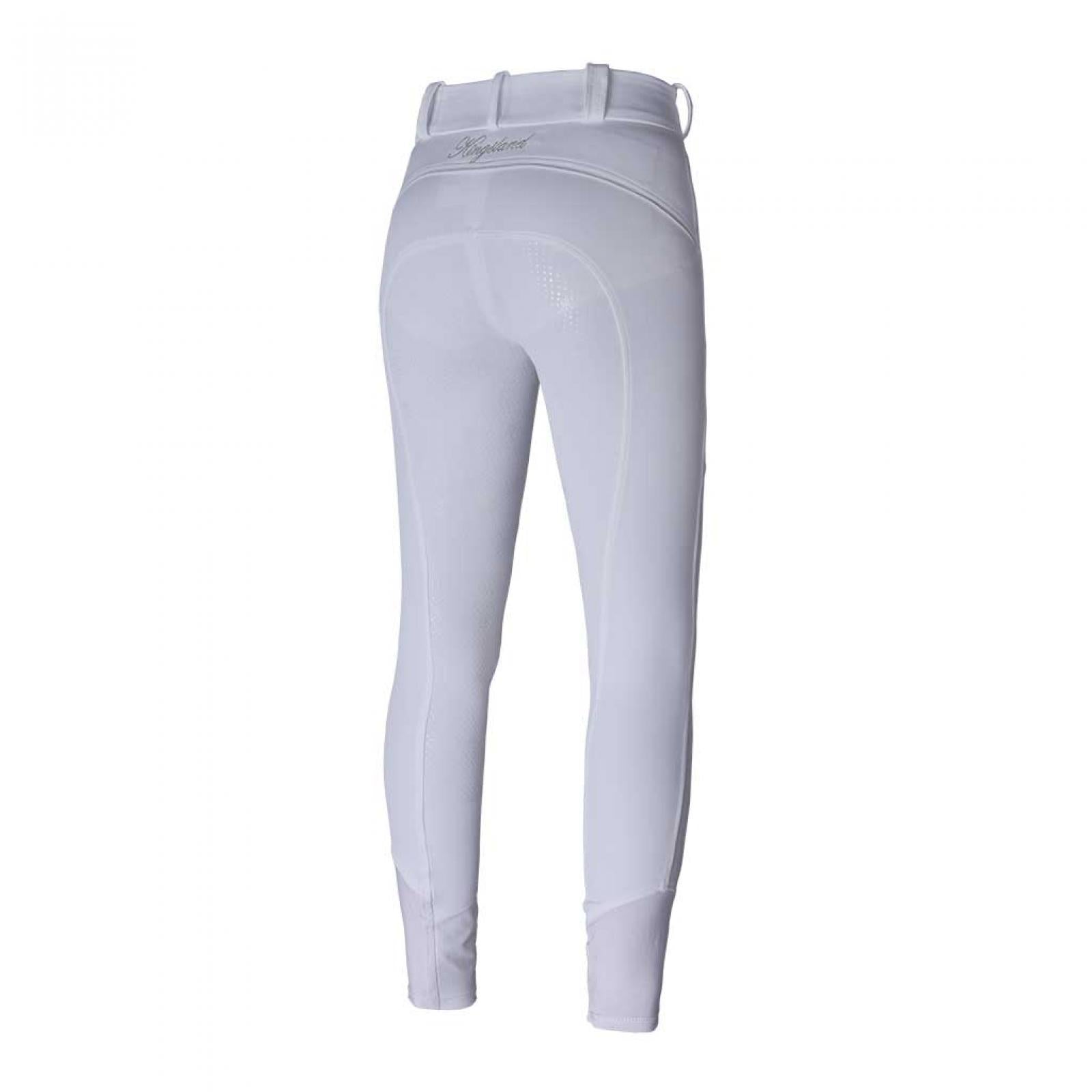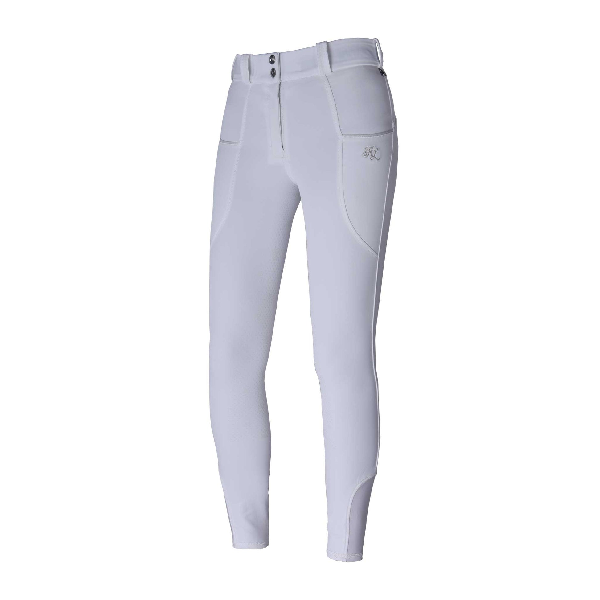 High waist rise breeches with 2 crystal buttons in front and in soft technical fabric. Powerful 4-way stretch. Water, dust and grease repellent, and breathable. Full grip with logo. Side panels with pockets for mobile phone. Elastic piping with lurex on pocket edge and on back yoke. Silver lurex embroidery in front and on back yoke. Metal hook on side belt loop. 204-brfg-514